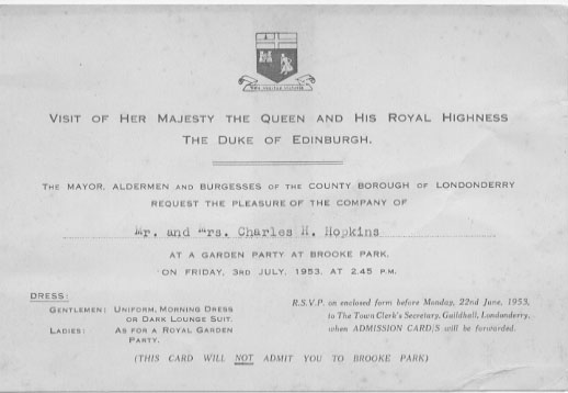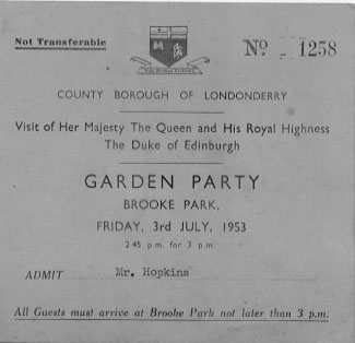Invitation ticket for Queen's Tea during Queen's visit to Derry - Circa 1953