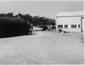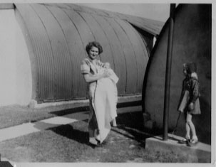 Madlin Hopkins with Gary, outside Clooney Base dependent housing Quonset Huts - Circa 1952