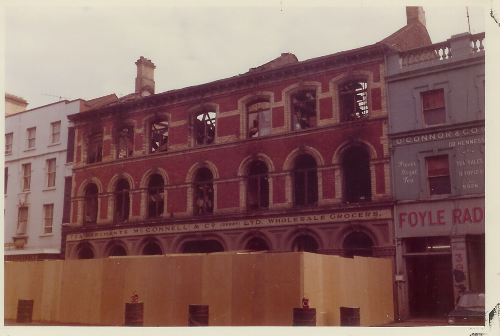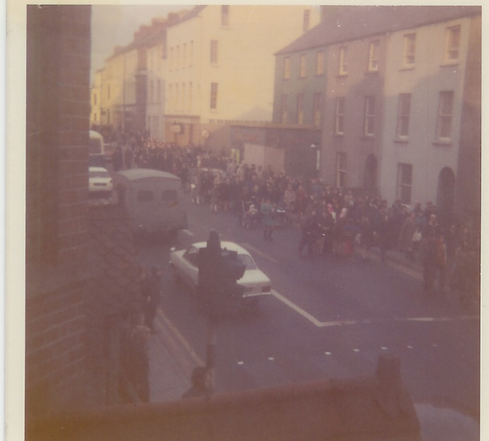 The crowded street is from workers leaving Ebrington Shirt Factory