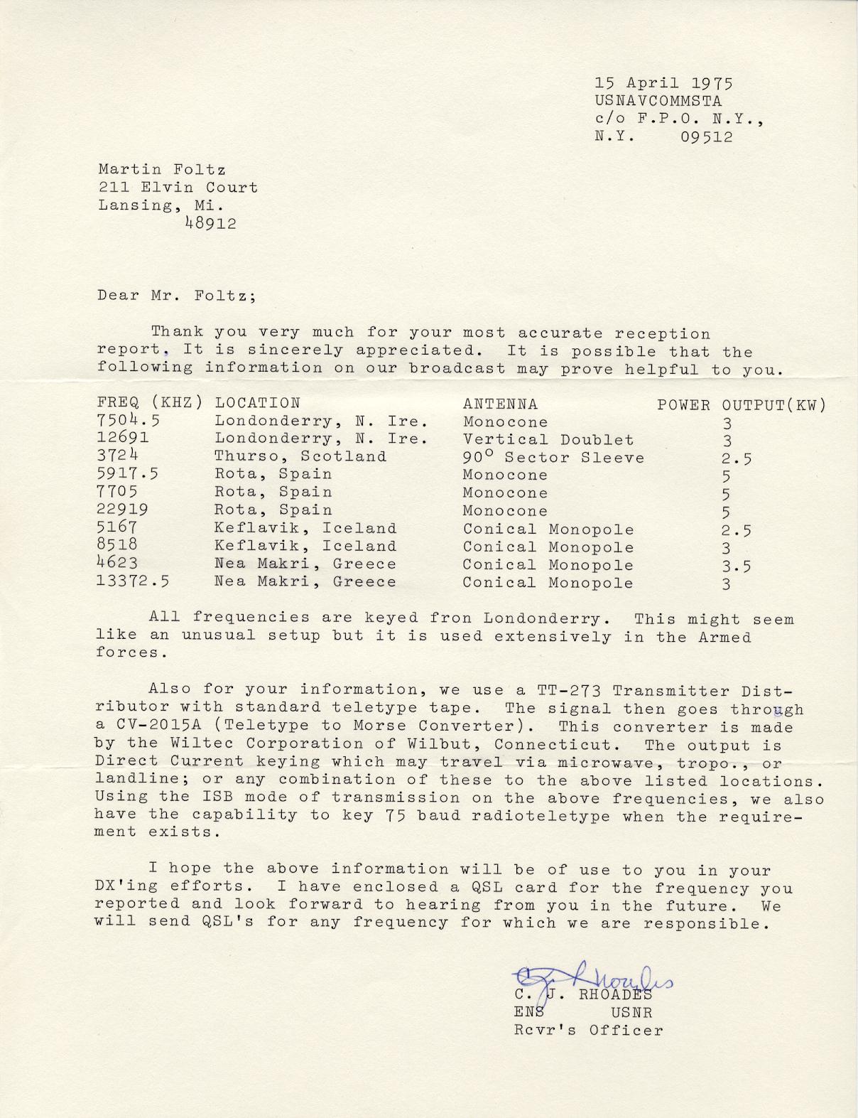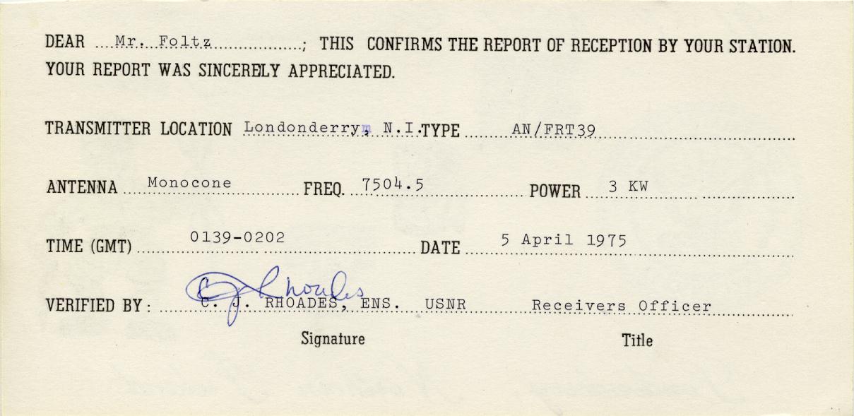 The following QSL cards and accompanying letter were received by Mr. Martin Foltz in 1974 and 1975, a Short Wave Listener who submitted a reception report and request of verification to NST.