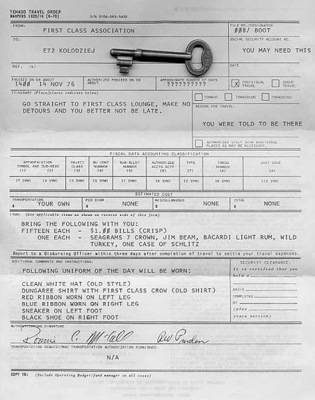 Initiation Form and Key for Dennis Kolodziej to the First Class Petty Officer's Club