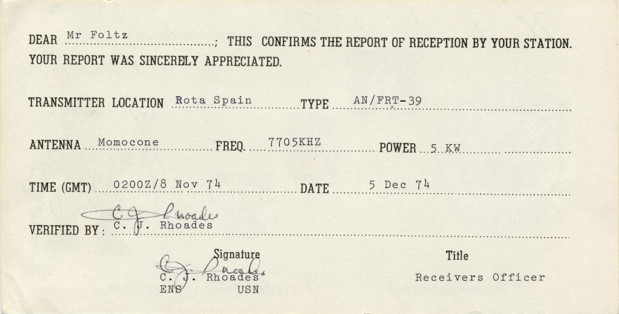 Back of first QSL card received by Mr. Foltz, note that the transmitter location (QTH) is Rota Spain